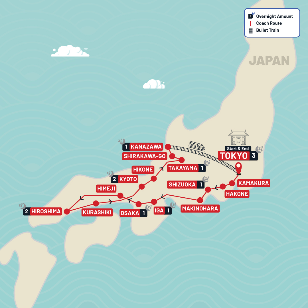 Experience the highlights of Japan with this 13-day group tour. From skyscrapers and flashing lights to ancient temples and serene gardens, you’ll see it all! Begin in Tokyo, Japan’s capital, and travel to Hakone and Shizuoka for breathtaking Mount Fuji views. Explore Hiroshima, Takayama and Kyoto on guided tours. Delve into Japan’s heritage with visits to Kurashiki, Kanazawa and Shirakawa-go. Experience Osaka’s vibrant nightlife and enjoy local delicacies. Learn about Ninjas, Sumo wrestlers, Samurai and more! Take the Shinkansen bullet train and experience modern Japanese innovation. This Japan tour package has it all!